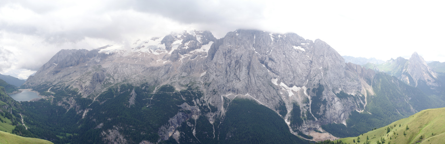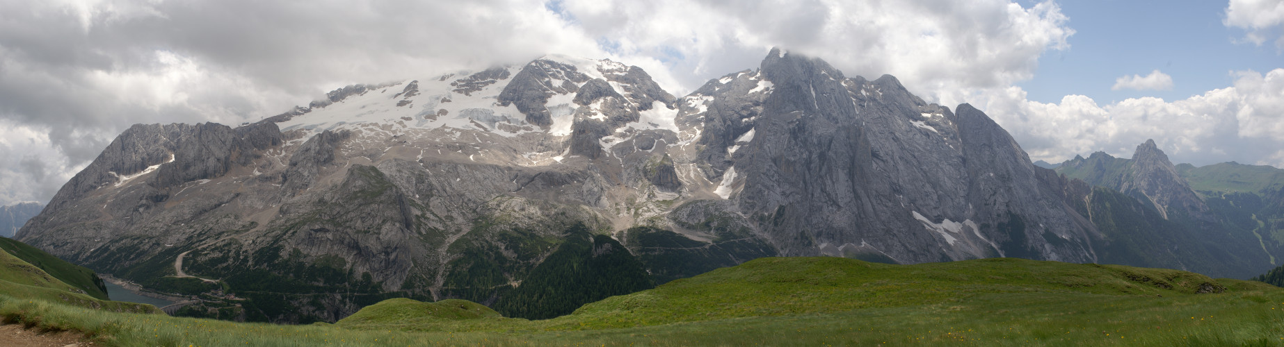 We the walked around the corner of a hill, and along a long edge of a ridge, with a great view of the Marmolada.